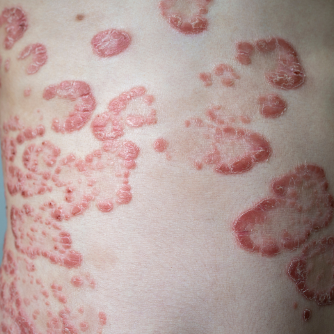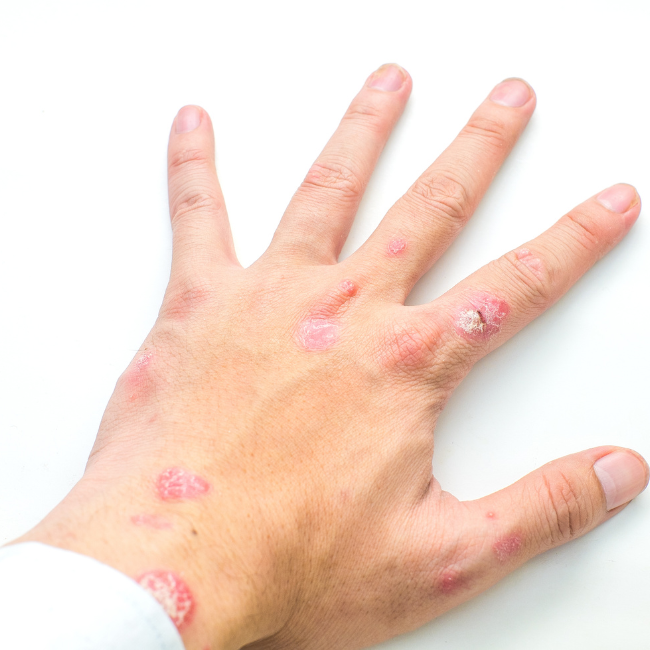 - 피부 발진: 가장 흔한 증상 중 하나로, 빨간색 또는 은백색의 두꺼운 비정상 피부 패치가 발생합니다. 이러한 발진은 특히 팔, 다리, 등, 무릎, 머리와 같은 부위에 나타날 수 있습니다.